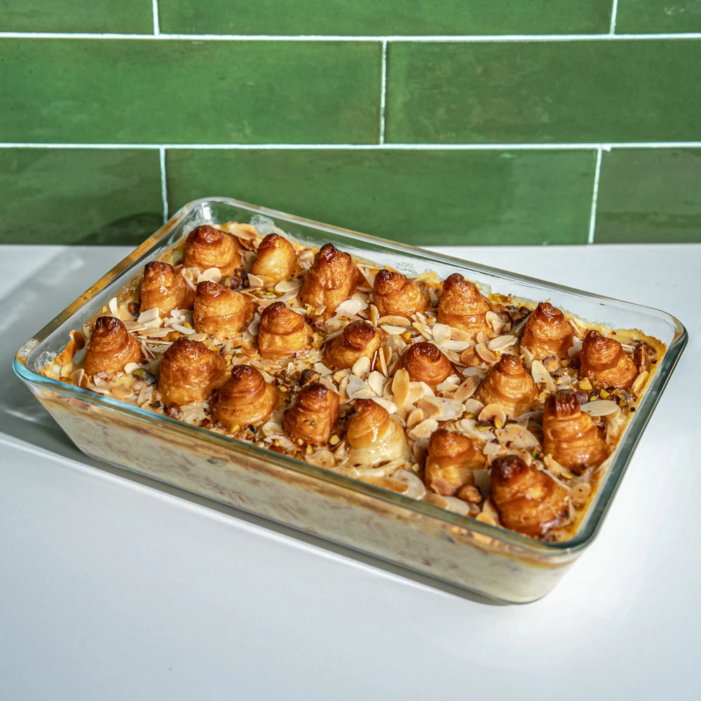 تعيد هذه الحلوى الكلاسيكية تشكيل حلوى بودينغ الخبز المصرية التقليدية وترتقي بها إلى آفاق إبداعية جديدة، وذلك من خلال استبدال العجينة العادية بالكرواسون الجاهز والغني بالزبدة وعجينة الباف باستري المحضرة مسبقاً. والنتيجة تحفة فنية ذات قوام متنوع: فالطبقات تخبز على قاعدة من الكريمة المحلاة وتتحول إلى كاسترد مخملي رائع، فيما تكتسب الطبقة العلوية شكلاً ذهبياً مقرمشاً ومميزاً.