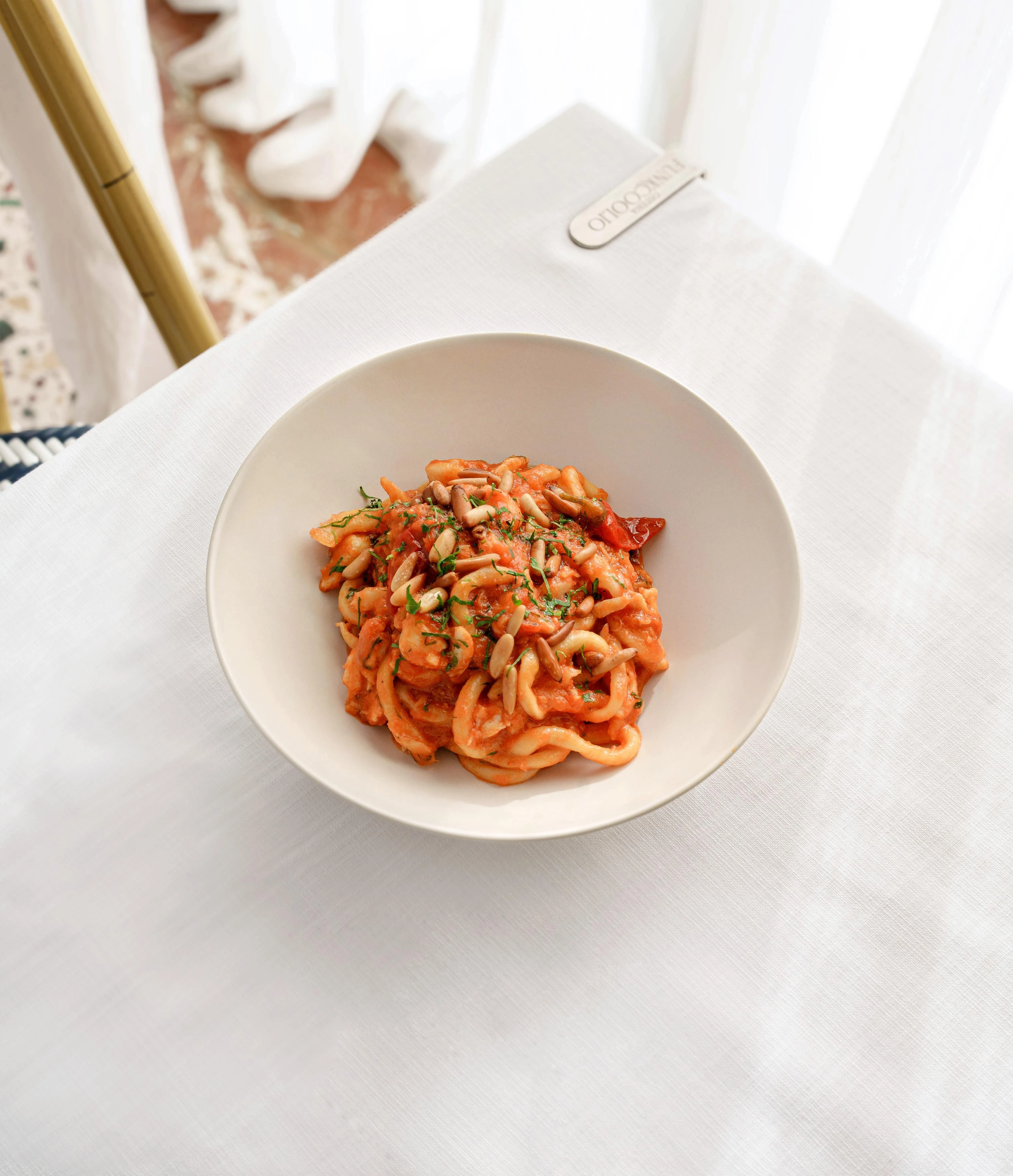 وبيتشي كراب بومودورو هو طبق يرتقي بخيارات الطعام الإيطالية الكلاسيكية المريحة من خلال إضافة لمسة من ثمار البحر الفاخرة إليها. وتتميز هذه الوصفة باحتوائها على معكرونة البيتشي السميكة المصنوعة يدوياً والتي تعرف بقوامها الريفي وقدرتها على امتصاص الصلصة حيث تُغمس في صلصة بومودورو المصنوعة من الطماطم الناضجة والثوم والأعشاب مع لمسة من الفليفلة الكالابرية الحارة. وهكذا يلتقي لحم السلطعون الطازج حلاوة خفيفة ونكهة مالحة عميقة، ما يكمل طعم الصلصة اللاذعة.