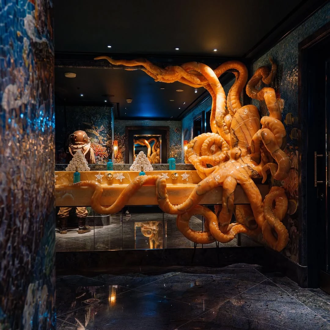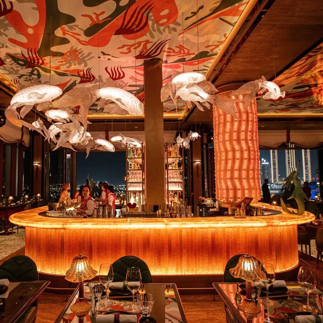 منذ افتتاحه في قلب مركز دبي المالي العالمي في مطلع العام 2024، أصبح Sexy Fish دبي وجهة مفضلة لدى كثير من الذواقة قي المدينة بفضل فخامته المبهرة. ويحمل التصميم الداخلي في هذا المكان المميز توقيع استوديو مارتن برودنيزكي الشهير، وهو يجمع بسلاسة الحداثة الكلاسيكية والأجواء السريالية المستوحاة من عالم البحار. وتكمل هذا الديكور أعمال فنية عالمية المستوى، حيث تبرز تركيبات مذهلة موقعة من فنانين بارزين مثل داميان هيرست ومصابيح على شكل أسماك أنجزها المصمم الأسطوري فرانك جيري. ويعكس كل ركن في المطعم – من البار المبني بلون العقيق الوردي المتوهج إلى الفسيفساء النابضة بالحياة والتي تذكر بمناظر الشعاب المرجانية، والحمامات المذهلة – التزاماً راسخاً بجماليات البحر الفخمة.