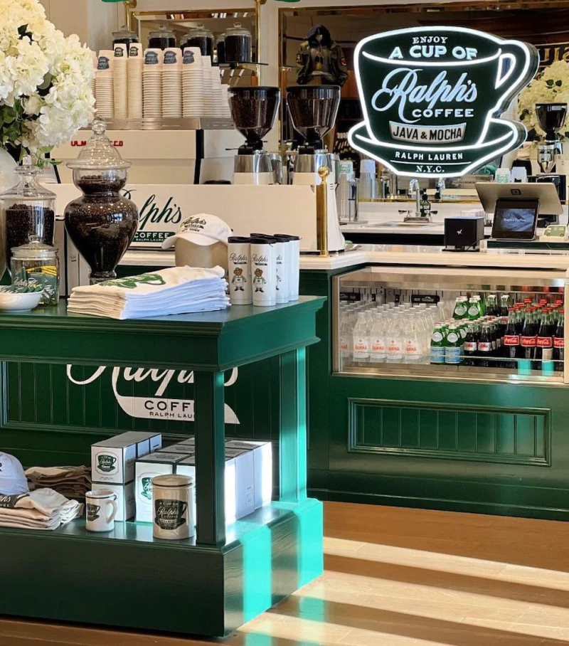 The cafe evokes a sense of timeless preppy Americana, serving delicious house-blend coffee and specialty desserts. Ralph Lauren’s iconic custom china, in a distinctive hue of green, adds a layer of nostalgia. There's even a retail corner offering branded mugs, tote bags, hats and even dog bowls for purchase. Why not take a little bit of Ralph Lauren's signature style home with you?