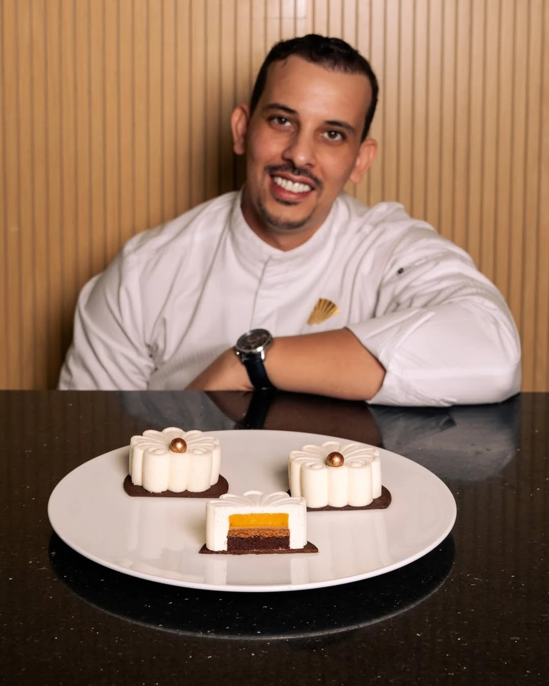 This sophisticated sweet delight is a masterclass in regionally-inspired patisserie, balancing a deep, olive-oil-enriched chocolate sponge with a vibrant, tropical heart. The unexpected brightness of mango and banana, infused with the precious aroma of saffron, cuts through the nutty crunch of a hazelnut praline base. Enveloped in a cloud of vanilla-scented mascarpone mousse, the result is a textured, multi-layered journey that feels like a modern tribute to the flavours of the Gulf.