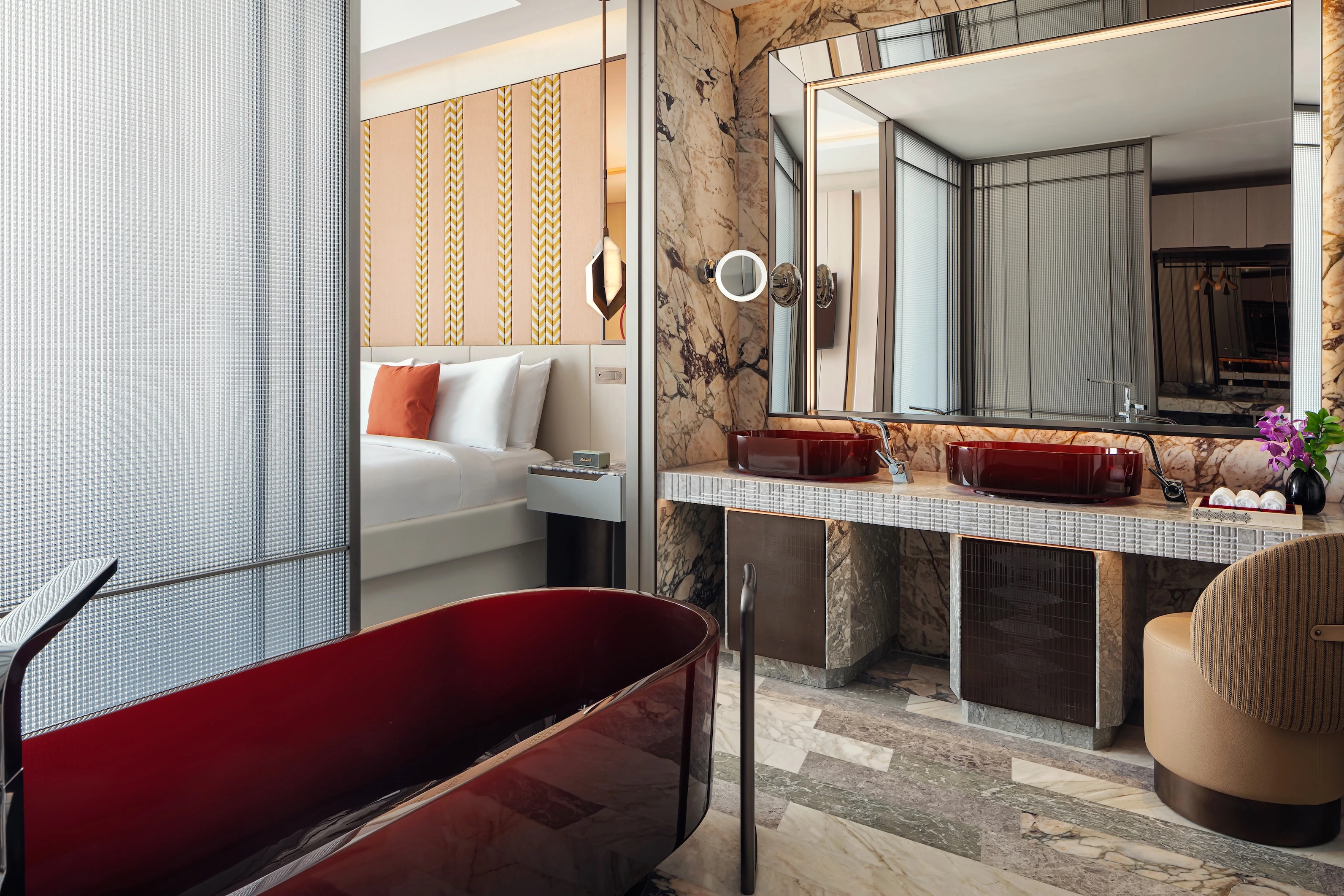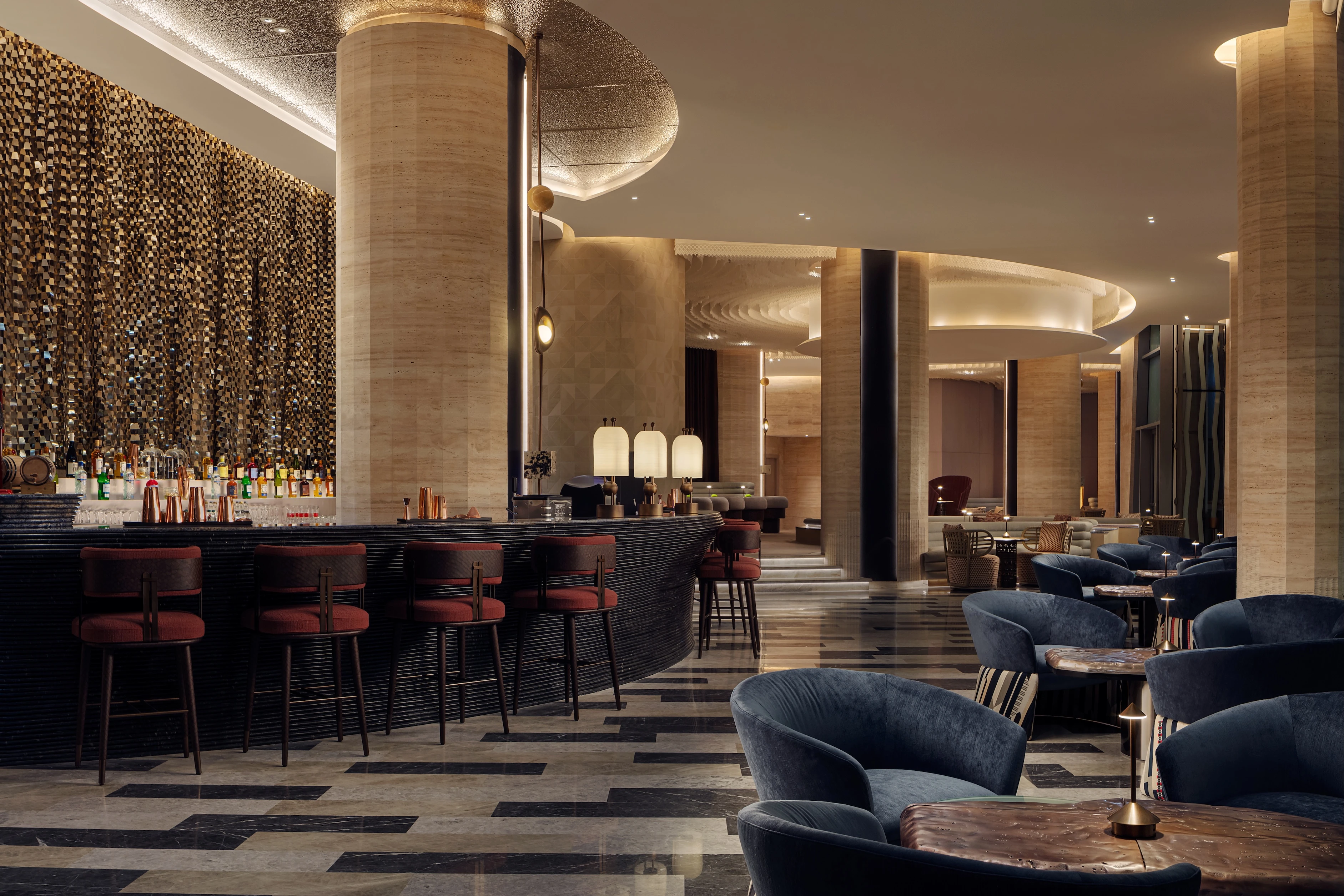 Designed by the renowned LW Design; the people behind Ritz-Carlton Masai Mara Safari Camp, The Dubai EDITION and Raffles Hotel in Shenzhen, China. The hotel’s interiors serve as a sophisticated dialogue between the W brand’s bold aesthetic and Saudi Arabia’s rich cultural heritage. The W brand is known for its quirky, unique and sometimes bamboozling take on interior design, this new location of the hotel takes direct inspiration from Najdi textiles and Al Sadu weaving patterns, utilising geometric textures and materials like veined marble to mirror the surrounding desert landscape.
