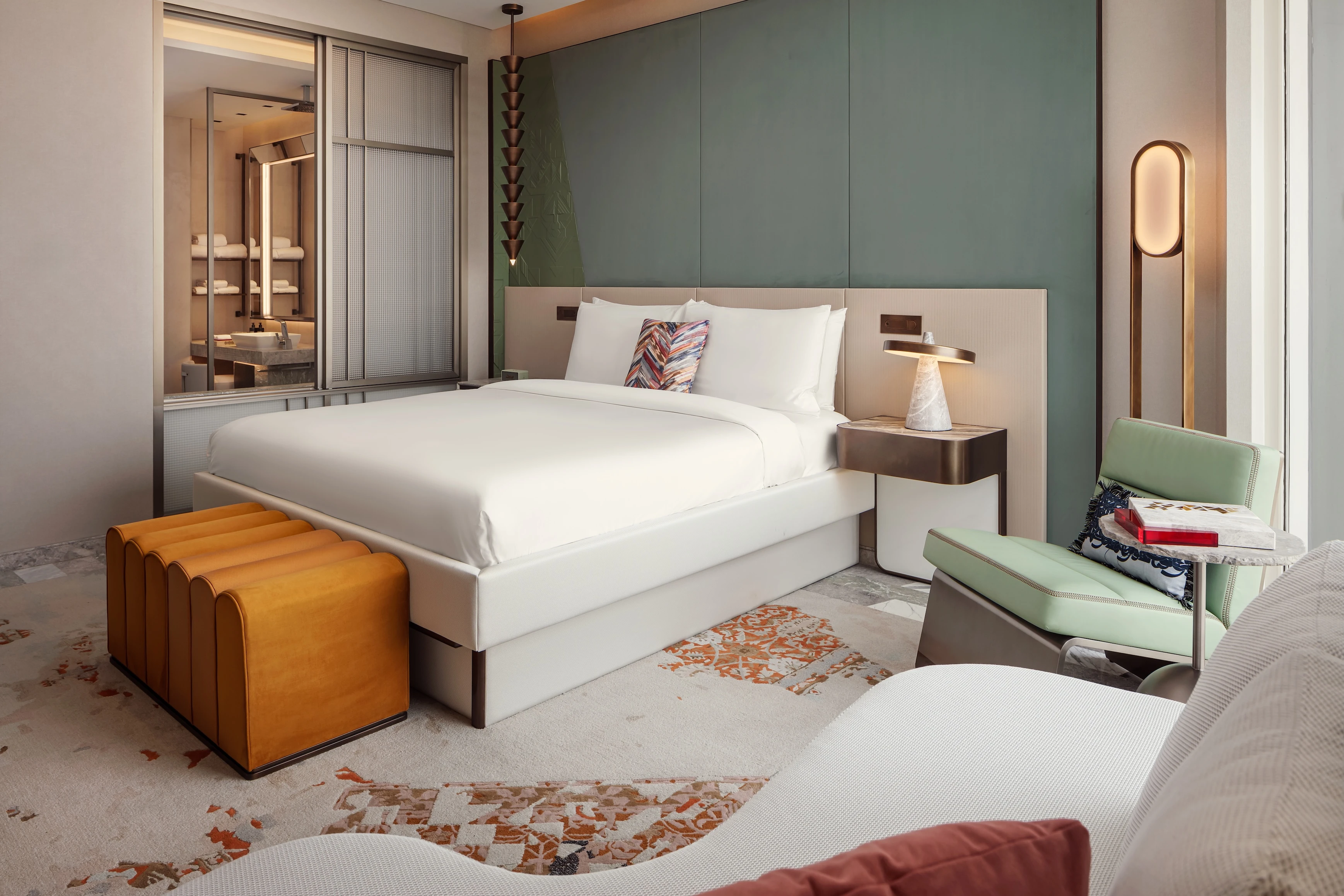 The artistic heartbeat of the property is highlighted by the work of acclaimed Saudi artist Abdulnasser Gharem. Upon arrival, guests are greeted by a massive six-metre tapestry in the lobby, while guest rooms feature bilingual typography wall art that bridges traditional script with modern expression.